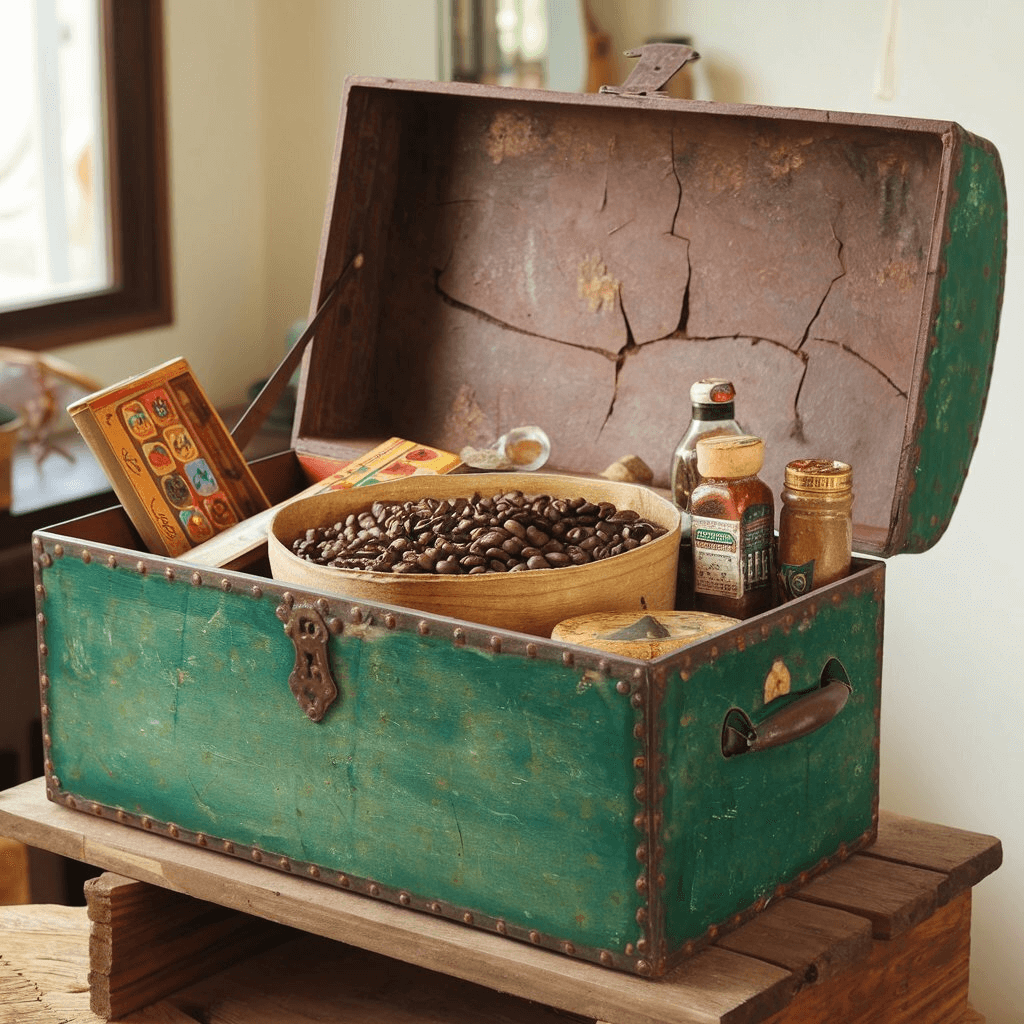 A box, basket, or container; colloquially, a box filled with memories, treasures, or even magic.